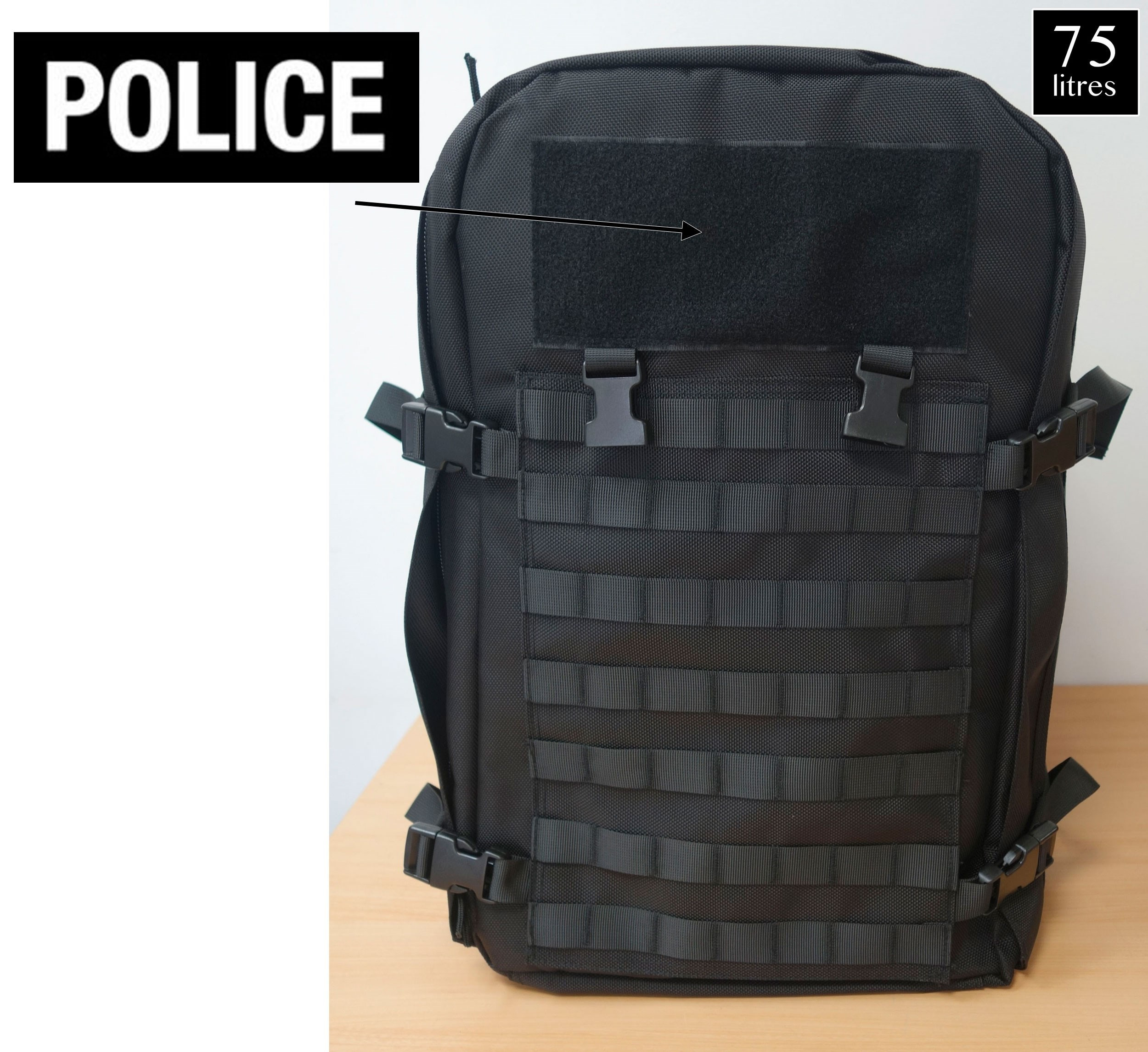 Avec marquage POLICE inclusGrande capacité – 100% Polyester 1680D – Personnalisable grâce à l?auto-agrippant extérieur- Attaches molle extérieures- 2 grandes poches côtés extérieures avec fermeture à glissière de 32cm X 21cm – Dans le compartiment avant : 2 grandes poches zippées de rangement intérieures en plastique transparent (28 X 18 X 3,5cm) – Partie centrale rembourrée pour matériel informatique ou autres accessoires- Dans le compartiment arrière : nombreux compartiments intérieurs modulable et auto-agrippants- Patte de transport héliporté – Ceinture ventrale amovible – Dos ergonomique et respirant qui assure un confort optimal – Dim : hauteur 52cm X largeur 45cm X profondeur 32cm Article réservé aux professionnels vendu sur présentation de justificatifs (carte professionnelle, pièce d’identité, justificatif de domicile)