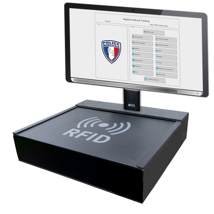 La borne « Desktop Full » est un élément global qui intègre le module AddLock Tracking » et les différents matériels aux technologies HF, RFID et QR Code .