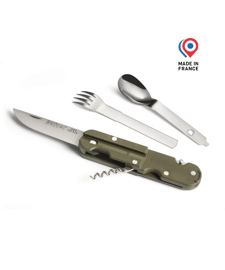 Le couteau Bivouac avec couverts incarne l’alliance parfaite entre robustesse, polyvalence et fiabilité, tout en étant un produit authentiquement français. Reprenant le design du modèle original utilisé par l’armée française dans les années 90, il est conçu pour être le compagnon idéal de vos expéditions en plein air.