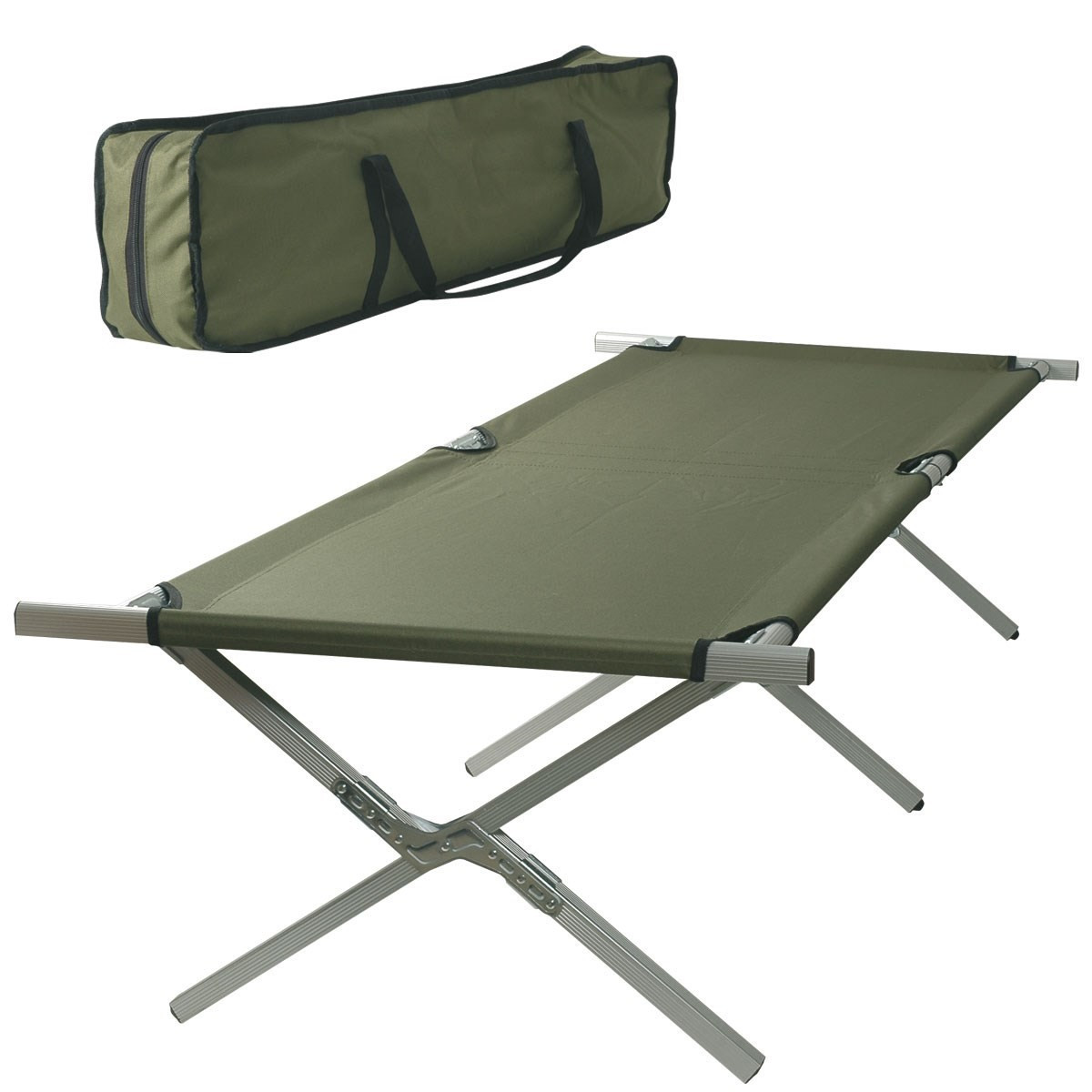 Pour vos missions en extérieur, optez pour un lit de camp type US en aluminium, conçu pour résister aux conditions les plus exigeantes. Léger à transporter et rapide à installer, il assure un repos optimal même en pleine nature. Parfait pour les militaires en bivouac. Ne laissez rien au hasard, choisissez un équipement fiable et robuste, pensé pour le terrain. Structure en aluminiumToile en polyesterLongueur 190 x 66 x 40.5 cmDimensions plié dans sa housse : 94 X 19 X 11 cmPoids 5,06 kgSupporte jusqu’à 120 kgLivre dans son sac de transport
