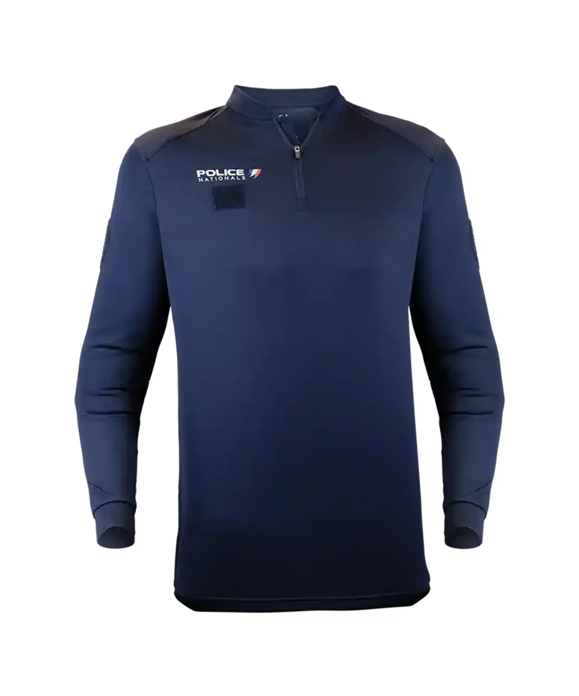 Polo manches longues Police Nationale marine avec col zippé, logos officiels, surfaces auto-agrippantes pour grade et écussons, renforts épaules et tissu résistant en polyester. Confort et fonctionnalité pour une utilisation professionnelle.